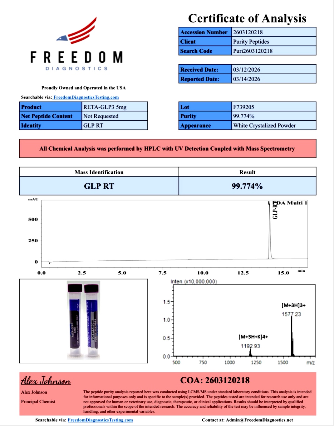 We believe reliable research starts with verified data and which is why every peptide we offer undergoes comprehensive analysis to confirm its identity and structural accuracy. Each batch is reviewed by certified U.S. laboratories, ensuring your high purity peptides meet strict scientific criteria before they ever reach your workspace.